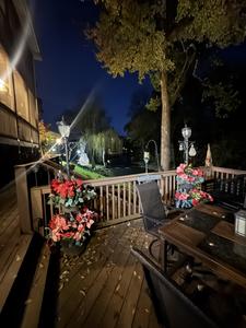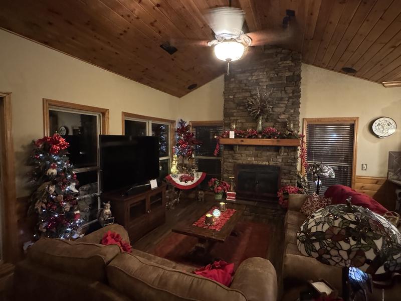 With everything available on the inside, it sounds as if you would not need to go outside but trust us you will. To the right of the entrance on the main level, there is a large patio area that is loaded with everything you need for the perfect family outing. Here you will find an outdoor lounge area with year-round stone gas fireplace, Moderno 6-piece patio seating, table with wrap around glowing concrete seating, 70-inch flat screen TV, and an outdoor kitchen with a gas grill, sink, mini-fridge, and concrete countertops that glow at night. Just off from the living room is a screened in back deck that features two cushioned chairs, four designer bamboo chairs, three tables, a 32-inch flat screen TV, and a year-round electric fireplace. There is another screened in deck on the lower level that comes with four designer bamboo chairs, a cushioned chair, and a table. This deck connects to a third lower-level deck that is closer to the water and comes with a table with 6 chairs and an umbrella, two wooden benches, a metal bench, and two Adirondack chairs. This deck is located right next to the Little Pigeon River and is great for fishing, and has a smaller deck connected that has a charcoal grill and a concrete bench. With everything available outside of Crystal Waters, you may never want to go back inside.