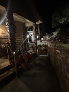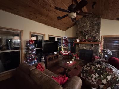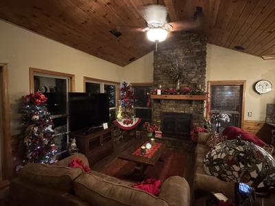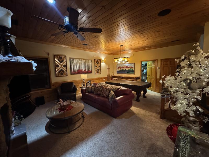 When you walk downstairs, you enter the game room/second living room that the kids will love. Here you will find a pool table, slot machine, arcade machine, leather sleeper sofa, 70-inch flat screen TV, and a second seasonal stone gas fireplace. There are two bedrooms and one bathroom on this level as well. The first bedroom offers a King size bed with a bamboo adjustable/massaging mattress and a 36-inch flat screen TV, and the second bedroom offers a queen size bed with a bamboo adjustable/massaging mattress and a 36-inch flat screen TV. The bathroom comes with a jetted tub/shower combo.
